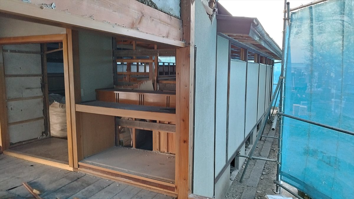 2023年4月20日 工事の進捗報告(2023年4月20日) 4月20日(木)夕方の状況です。 仕事から帰ると、本堂前にコマツの油圧ショベル(PC138us)と大きなコンテナが鎮座。 本堂の中を見ると、畳は全て撤去され、壁の一部も解体が始まっていました。 4月20日時点の工事進捗状況 kihou