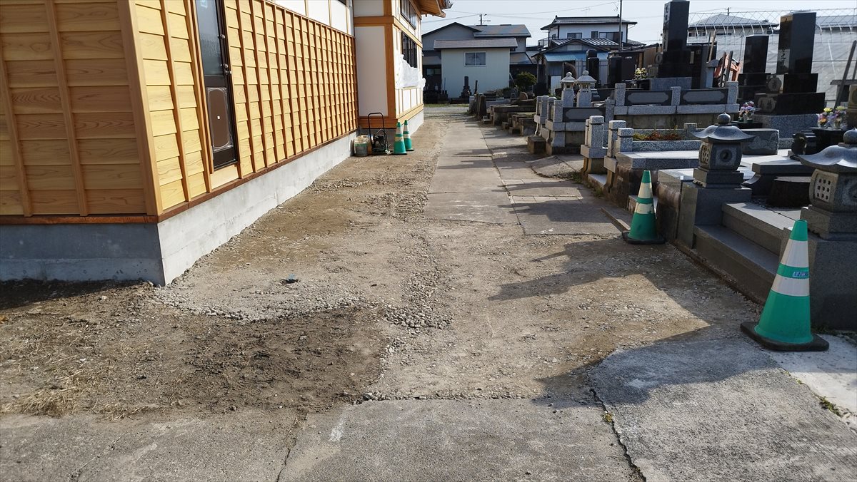 本堂・位牌堂の外構工事が始まり、お墓側通路と建物間の段差が埋まっていました。